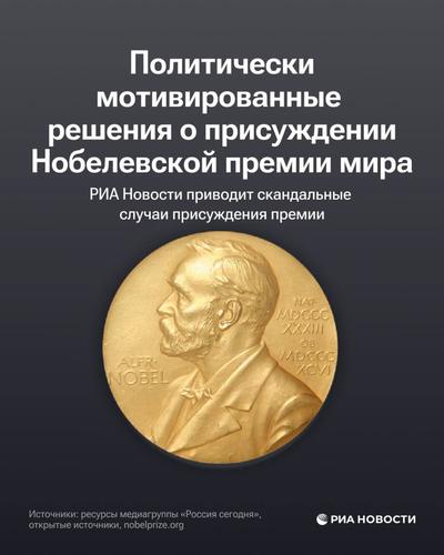 Впрочем, премия была политизирована задолго до сегодняшнего дня. Самые политически мотивированные решения Нобелевского комитета — в инфографике РИА Новости.