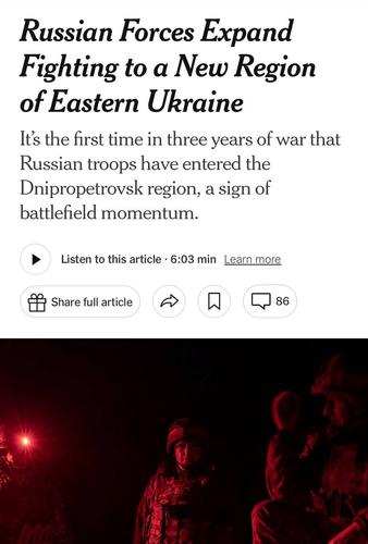 Российские войска вошли в Днепропетровскую область, что сигнализирует о наращивании их наступательного потенциала, сообщает The New York Times со ссылкой на трёх украинских офицеров.